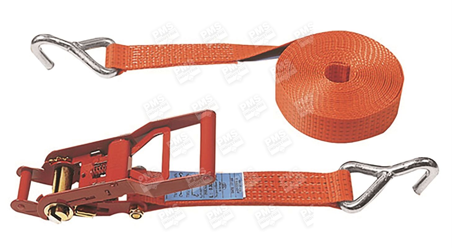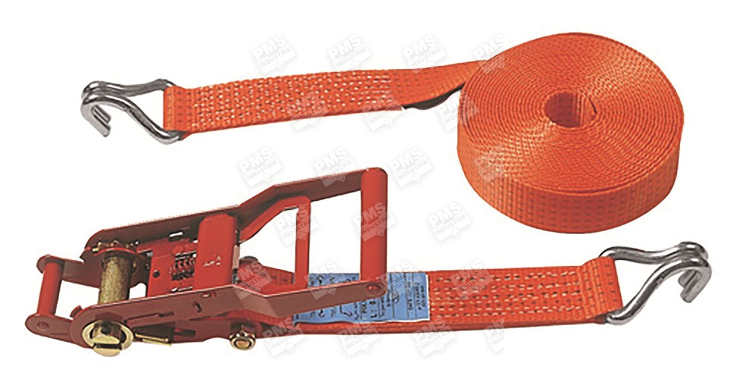 The multiplied tensioning ergonomic ratchet is composed of a gear system ensuring a multiplied tensioning force, and of a handle tensioning the webbing by wrapping it around its axis. These heavy truck lashing systems with 50 mm wide webbing have a covering LC of 5 000 daN – 7,5 T (breaking strength of the webbing only 7,5 T or 7500 daN) and a STF of 400 daN. They are manufactured according to standard EN 12 195-2.