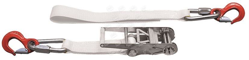 These lashing systems with 75 mm wide webbing are intended for use on vehicle carrier, for heavy duty. The ratchet with secured opening is composed of a gear wheel and a handle, tensioning the webbing by wrapping it around its axis. They have a covering LC of 7 000 daN – 11 T (breaking strength of the webbing only 11 T or 11 000 daN) and a STF of 350 daN.