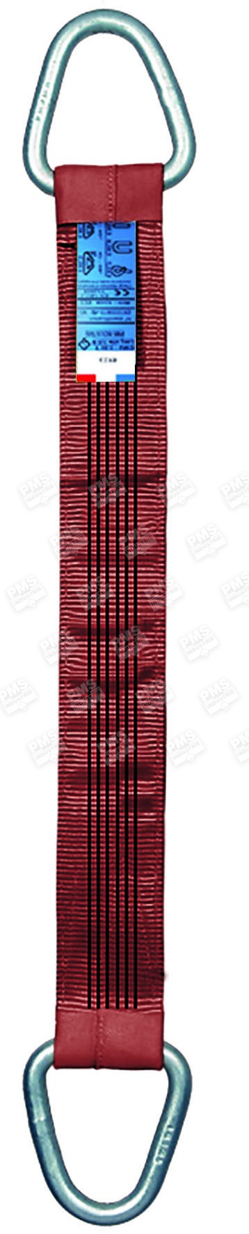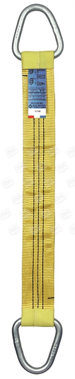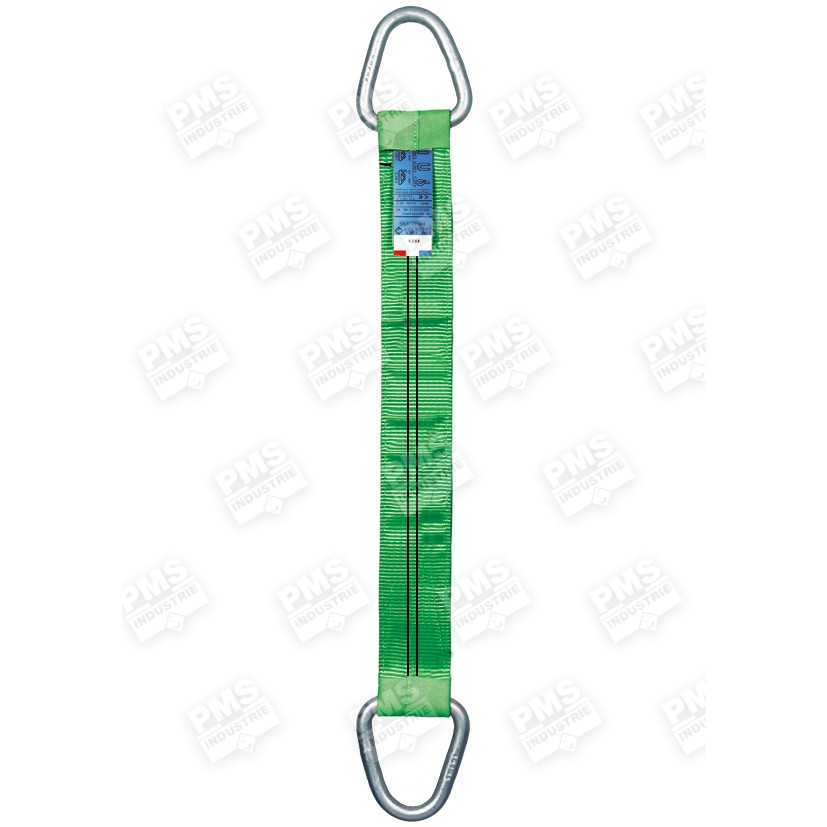 Polyester provides high resistance to friction, abrasion, UV and chemical products. B-type flat webbing sling (double ply) with two male round wire rings (category 4). Be careful, according to standard EN 1492-1+A1, make sure to always protect your slings if used in a lifting configuration with sharp angles. A wide range of protections is available: polyurethane, PVC or leather sleeve, polyurethane protection keeper, etc. Contact us to know the other optional materials available for ends reinforcement. For smaller lifting capacities, use B-type slings (double ply). For lifting capacities higher than 20 tons, use C-type slings (4 plies).Features