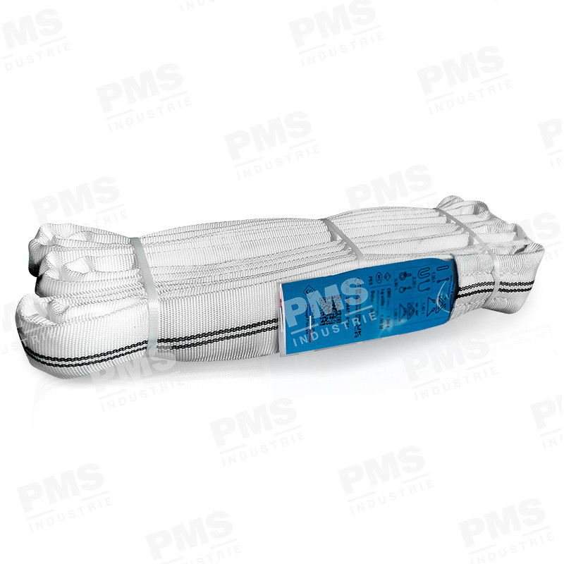 This white round sling, made from high‑tenacity polyester and protected by a flexible tubular sleeve, is ideal for clean or sensitive environments requiring high visibility. It is fully compliant with EN 1492‑2.