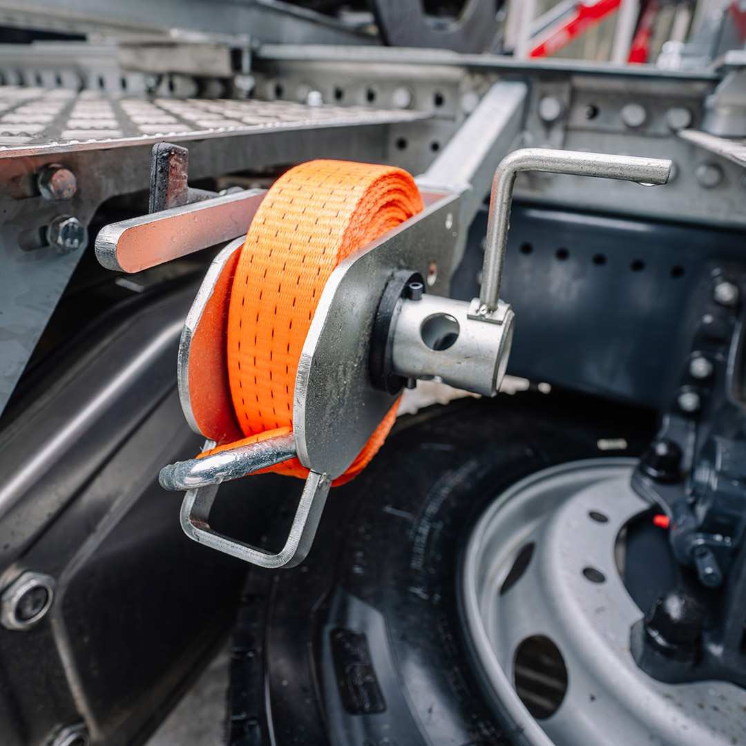 Sangle polyester avec crochet de cerclage plat fendu en acier peint. Système en 1 partie, configuration certifiée.