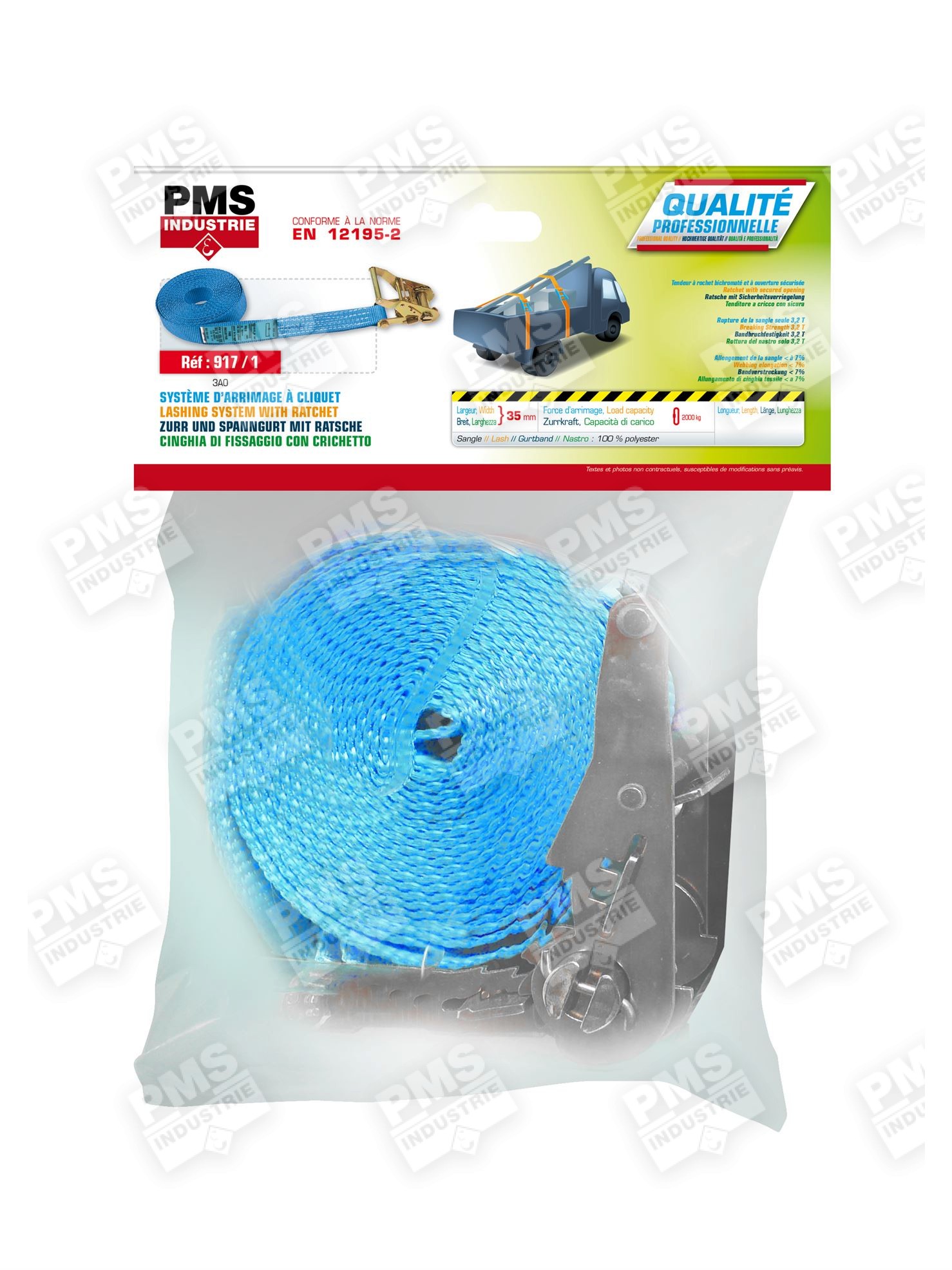 Ces systèmes d’arrimage sont destinés à une utilisation sur véhicules utilitaires légers et pour les artisans. Ils ont une LC en double de 2000 daN – 3,2 T (rupture de la sangle seule non cousue 3,2 T ou 3200 daN) et une STF de 250 daN. Le tendeur à rochet à ouverture sécurisée 917 est composé d’une roue crantée et d’une poignée à cliquet pour tendre la sangle d’arrimage. Il s’utilise avec une sangle de 35 mm de largeur.