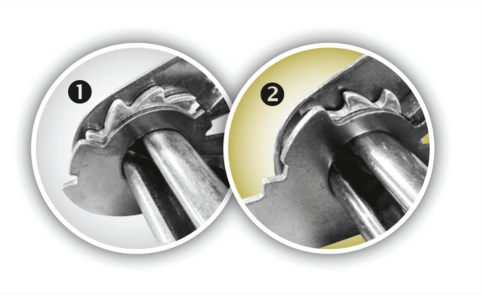 Sur le tendeur inversé (2), les dents sont retournées, il suffit donc de baisser le levier pour effectuer la tension.