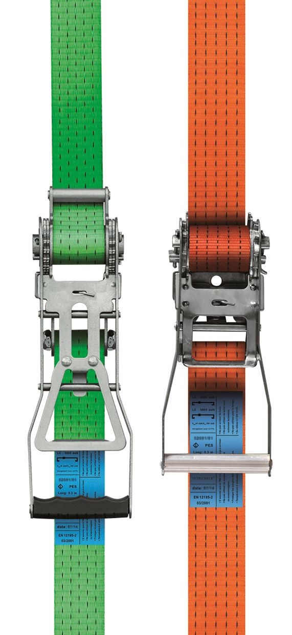 Le tendeur ergonomique, aussi appelé tendeur inversé a des engrenages retournés par rapport à un tendeur traditionnel. Il suffit donc de baisser la poignée, en appuyant avec le poids de son corps pour effectuer la mise sous tension du système d’arrimage. Ces tendeurs sont particulièrement adaptés pour les charges nécessitant un fort serrage, comme des billes de bois par exemple. Ces systèmes d’arrimage poids lourds avec sangle de 50 mm de largeur ont une LC en double de 5 000 daN – 7,5 T (rupture de la sangle seule non cousue 7,5 T ou 7500 daN) et une STF de 400 daN. Ils sont fabriqués conformément à la norme EN 12 195-2.